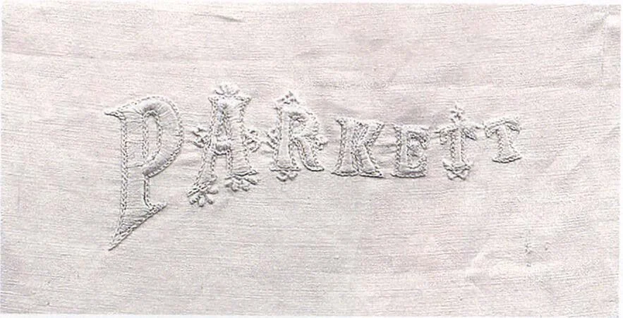 The name Parkett deliberately goes against the grain of conventional art publications. Parkett is the German word for parquetry, like the wooden floors that grace many exhibition venues. It is, in fact, a semantic goldmine in German, referring also to the theater seats that are closest to the stage, the public arena in general, and a dance floor. In French, le parquet stands for the State Attorney. What’s more, the word is easy to pronounce in a number of languages. Enzo Cucchi suggested that Mama Livia Curiger embroider the logo of Parkett on white linen. The idea appealed to us.